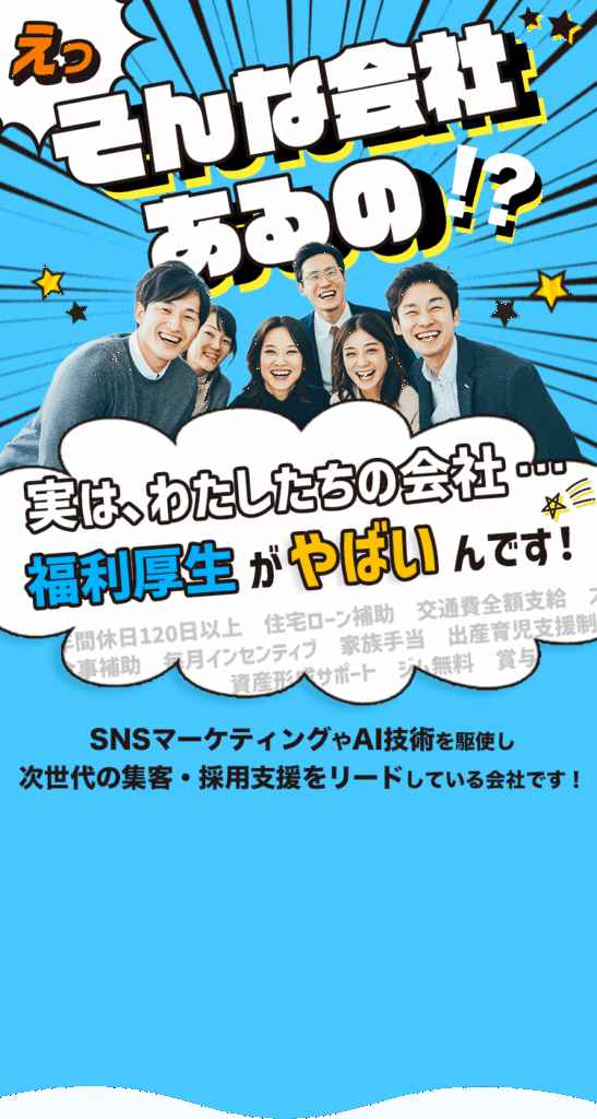 トップページ 募集要項 <職種> WEBプロモーション企画営業(正社員)<給与>・未経験の方 月給28万~30万+ インセンティブ(月)+賞与(年2回)・中途採用の方 限定で特別報奨金あり<勤務時間> 9:00〜18:00(実働8h)<休日>・年間休日120日以上・長期休暇(GW、夏季、年末年始など連休8~9日)・産休育休※有給積極取得推奨<仕事内容>・法人向けにSNS広告マーケティング・SEO提案・無理な営業なし、ヒアリング重視<必要資格> なし<福利厚生>・毎月昇給、賞与年2回・社会保険完備、交通費全額支給・家賃補助、住宅ローン補助・食事補助・ジム全額負担・健康診断・インフルエンザ予防接種・家族手当あり(配偶者・子供)・資産形成サポート 株式会社アクスワン 代表 藤原 知明 従業員数 77名 電話番号 03-6657-2900 本社所在地 〒131-0045東京都墨田区押上3-30-10-2F最寄り駅 : 東武スカイツリーライン 押上駅 徒歩5分 株式会社アクスワン